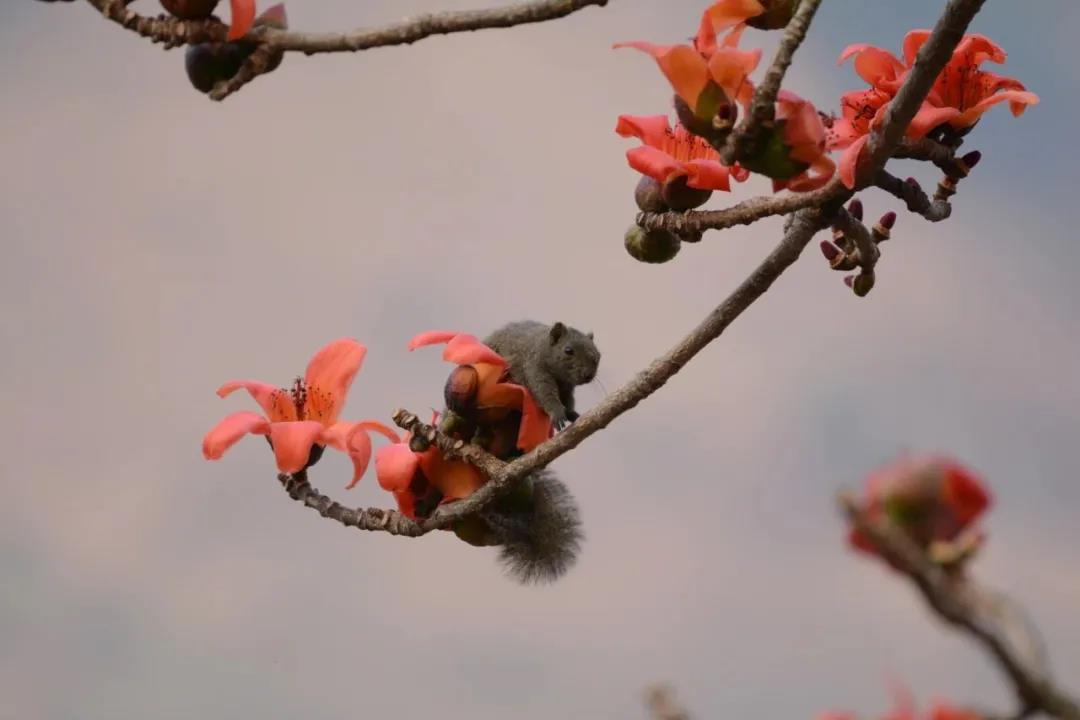 每年春節(jié)前后木棉花開時,吸引著眾多的動物來啄食花朵、吸食花蜜和為其傳粉。木棉樹成了蜜蜂、木蜂、倭松鼠、印支松鼠、白喉紅臀鵯、灰腹繡眼、長尾縫葉鶯、灰卷尾、藍喉擬啄木鳥等動物的樂園。
