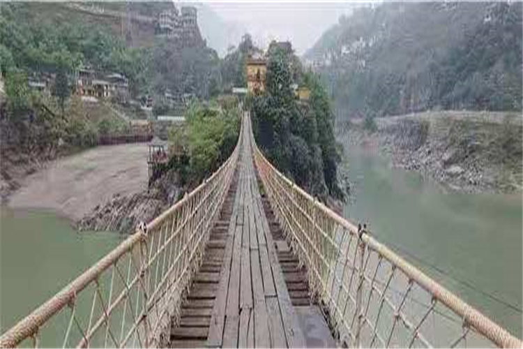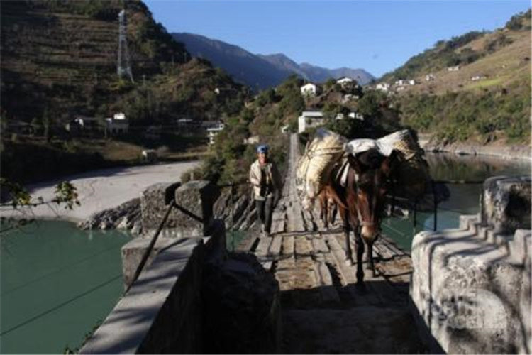 一座古老的吊橋連接著怒江兩岸,橋下江水碧綠深邃,岸上的小山村依山傍水,靜謐恬美。