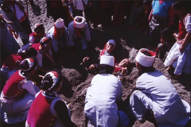 當(dāng)兩位男女青年心心相印時(shí),“埋”情人的游戲便開始了。一般先“埋”女人,后“埋”男人,最后才在伙伴們的幫助下,男女一起“埋”。然后裝著非常悲傷的樣子痛苦流涕,唱喪葬歌,跳喪葬舞。被埋者雖然大聲呼喊掙扎,請(qǐng)求旁人幫助解脫,但無(wú)濟(jì)于事,只好閉著眼睛,任伙伴們將沙子撒在自己的身上。取鬧過后,伙伴們又逼迫沙坑中的兩位意中人喝同心酒,才將兩人刨出來(lái)共同歡度?!奥瘛鼻槿藭r(shí),參加人數(shù)與規(guī)模大小不限,只要有熱鬧氛圍即可。