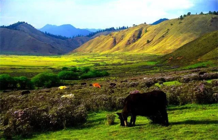 大羊場是一片高原牧場風光,主要由高山草甸組成,在草甸上向東可看見玉龍雪山、哈巴雪山的皚皚白雪;向西可盡覽碧羅雪山那綿延千里的磅礴氣勢;向北可遙望白茫雪山、梅里雪山的英姿;南面穿過原始森林則可到羅古箐情人壩。草甸兼有草原的壯美,又多了一份草原所沒有的靈秀之氣,成片的落葉松是大羊場的一大盛景。每年從5月底開始,一望無際的杜鵑綻放出紫色的花朵,隨著時間的推移,杜鵑由紫變紅,使大羊場變得紅紅火火、無比絢麗。周圍的小山包一座連著一座,構成了獨特的高原丘陵景觀。走進大羊場,猶如走進一個夢幻天堂。