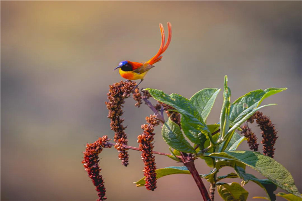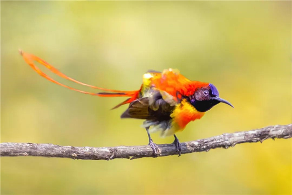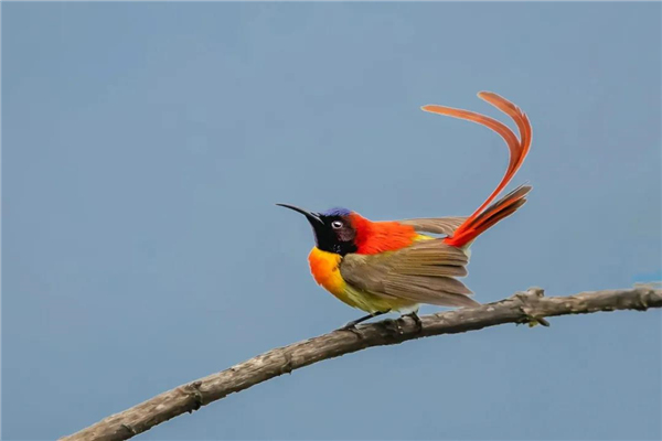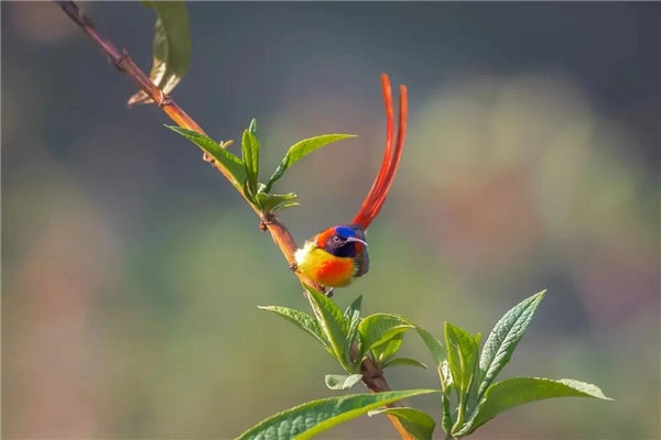 火尾太陽鳥小巧玲瓏,飄逸的紅尾修長(zhǎng)靈動(dòng)。
