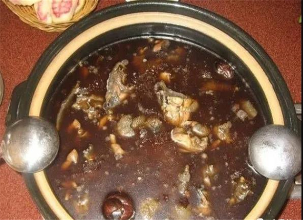 制法:把雞宰殺去毛,取出內(nèi)臟,清洗干凈剁成塊。鍋上火燒熱,下漆油,至六成熱時(shí)下雞塊爆炒至雞塊呈金黃色,把雞肉和漆油倒入砂罐內(nèi),加鹽、蔥段、姜片、白酒,蓋上碗,碗內(nèi)注入冷水,用面糊封嚴(yán)罐口,置于小火上燜兩小時(shí)即熟。
