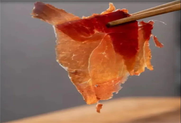 手抓飯中必不可少的老窩火腿,色澤通潤透明,肉肥而不膩,味道咸香適宜。