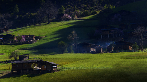 島上木質(zhì)房屋旁桃花綻放