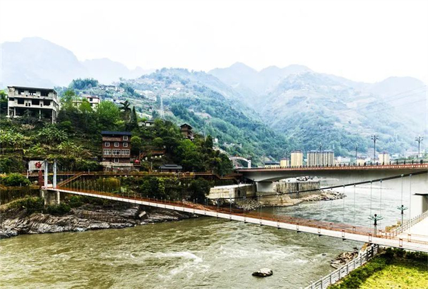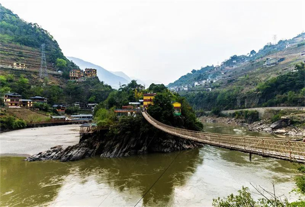 藍(lán)天白云、高山樹(shù)木、江水吊橋