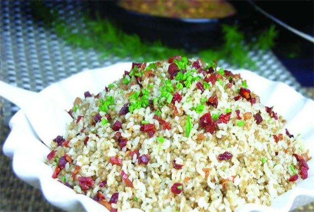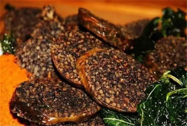 普米飯腸,是云南省怒江傈僳族自治州的特色美食之一。普米飯腸是以豬腸、大米飯、包谷米、生豬血、花椒面、草果面、鹽、香油等為原料制作而成。可以用刀切成小截,用炭火烤著吃,或者切成片,用油煎熟至酥黃后食用。配上一碗清茶,邊吃飯腸邊飲茶,美味可口,別有風(fēng)味。