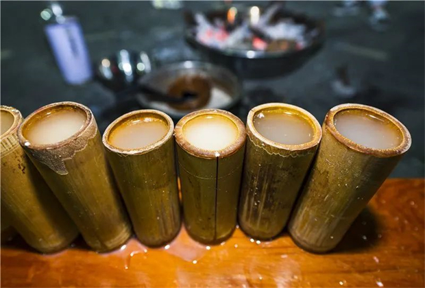 竹筒酒是獨(dú)龍族男女老少都愛喝的傳統(tǒng)飲料,它還被當(dāng)作青年男女訂婚時的禮酒和盛大節(jié)日中的喜酒。制作竹筒酒時,首先要在山中竹林里選擇最好的竹子,將其做成酒筒,然后把煮熟的小麥、大米或者高粱拌上釀酒用的酒裝進(jìn)竹筒內(nèi),存放七天之后竹筒酒就釀制好了。此時打開竹筒蓋,醇香的酒氣撲鼻而來,令人陶醉,頗有酒未入口人已醉的感覺。