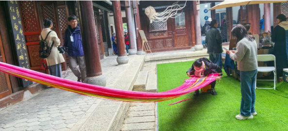 獨(dú)龍?zhí)褐谱骷妓囌古_前,傳承人現(xiàn)場演示腰機(jī)織布法,演繹著這項(xiàng)古老技藝的精湛魅力。此次有2家獨(dú)龍?zhí)褐谱骷妓嚪沁z工坊參展,獨(dú)龍?zhí)合盗挟a(chǎn)品兼具傳統(tǒng)底蘊(yùn)與現(xiàn)代美學(xué),除經(jīng)典毯品外,還有與上海秉波等企業(yè)合作開發(fā)的包、披肩、靠枕、筆記本、香囊等多款文創(chuàng)衍生品。參展期間,參展人員與其他省內(nèi)外的非遺進(jìn)行了交流,并與多家企業(yè)達(dá)成合作意向。