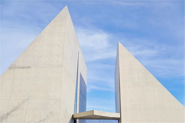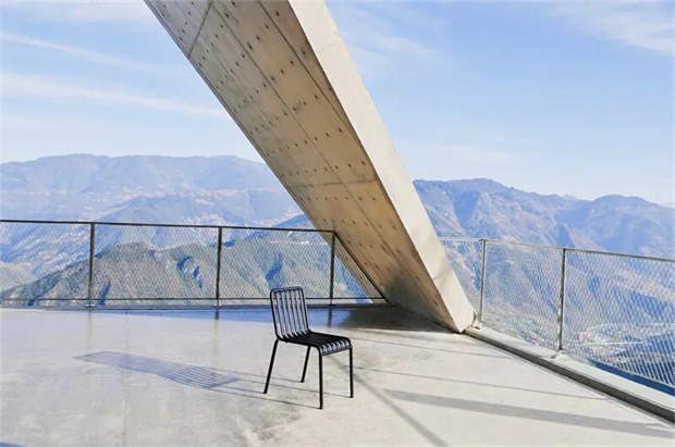從蜿蜒山道盤旋而上,抵達(dá)怒江州瀘水市陽坡村。形似弓弩箭頭的前衛(wèi)建筑嵌在懸崖之上,簡(jiǎn)潔的幾何形態(tài)回應(yīng)峽谷的