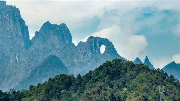 高黎貢山巔,巨大的大理巖溶蝕穿洞,形成猶如皓月當(dāng)空的奇觀——“石月亮”。天氣晴朗時(shí),日光穿透石孔,投射出奇