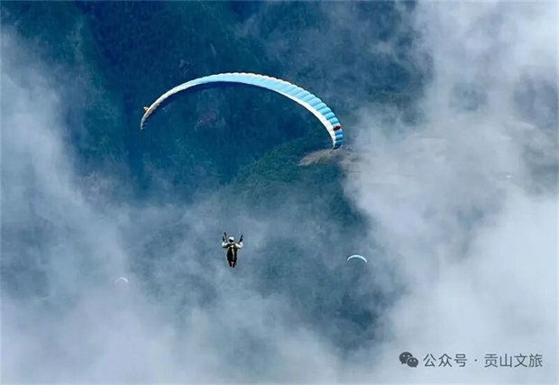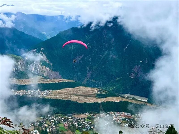 乘滑翔傘從貢當(dāng)神山起飛,在高空俯瞰云霧繚繞的丙中洛壩子,怒江如碧綠絲帶纏繞山間。風(fēng)聲掠過耳畔,腳下是村寨、